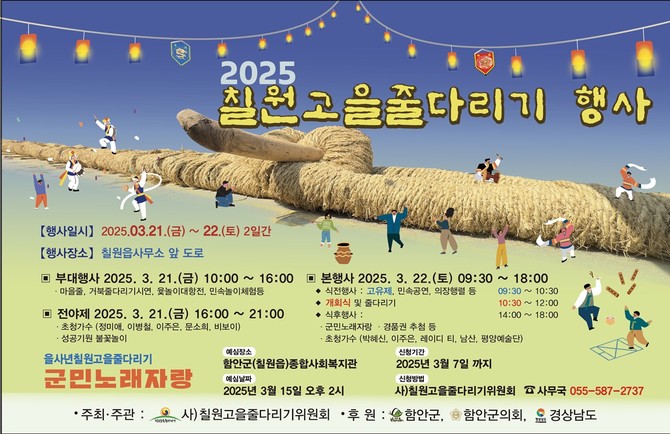 [프라임경제] 오랜 역사를 가진 함안 삼칠 지역의 대표적인 민속문화 행사인 '칠원고을줄다리기' 행사가 3월21일~22일까지 칠원읍사무소 앞 도로 일원에서 개최한다.