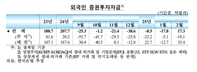 한은 관계자는 "2월 중 외국인의 국내 증권투자자금은 주식자금 순유출 지속에도 불구하고 채권자금이 상당폭 순유입으로 전환되면서 6개월 만에 순유입으로 전환됐다"라고 설명했다.
