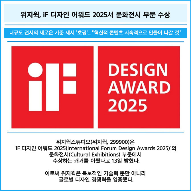 [프라임경제] 위지윅스튜디오(위지윅, 299900)은 'iF 디자인 어워드 2025(International Forum Design Awards 2025)'의 문화전시(Cultural Exhibitions) 부문에서 수상하는 쾌거를 이뤘다고 13일 밝혔다.
