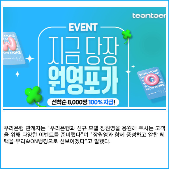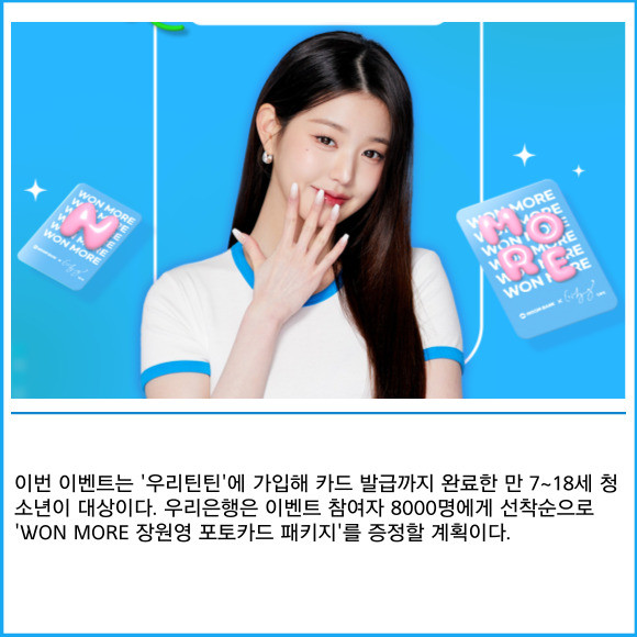 [프라임경제] 우리은행이 오는 31일까지 청소년 전용 용돈 관리 서비스 '우리틴틴' 신규 가입자에게 장원영 포토카드를 증정하는 이벤트를 진행한다고 13일 밝혔다.