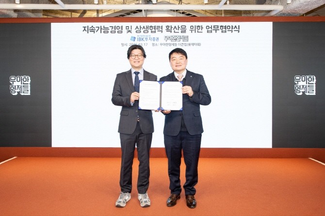 IBK투자증권은 17일 서울 송파구 롯데월드타워에서 우아한형제들과 '지속가능경영과 상생협력 확산을 위한 업무협약(MOU)'을 체결했다.