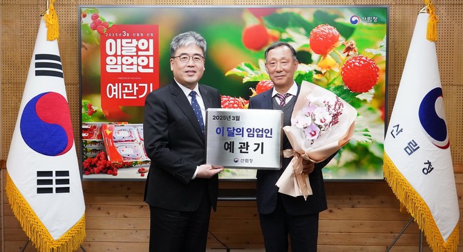 [프라임경제] 임상섭 산림청장이 17일 정부대전청사에서 이달의 임업인(3월)으로 선정된 예관기 준베리팜 대표에게 시상하고 기념촬영을 진행했다.