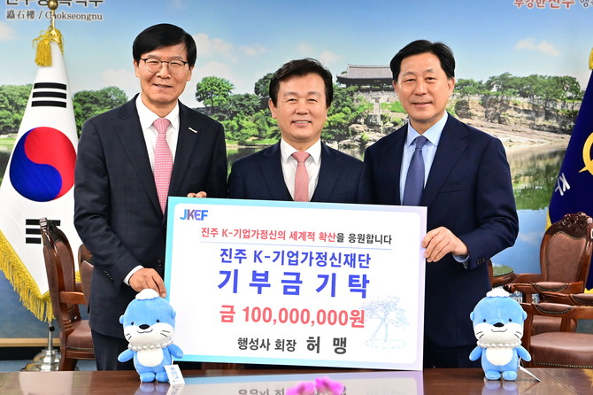 이날 기탁식에는 조규일 진주시장, 허맹 ㈜행성사 회장, 김종욱 진주 K-기업가정신재단 회장, 조복래 진주 K-기업가정신재단 사무총장 등 10여 명이 함께했다.
