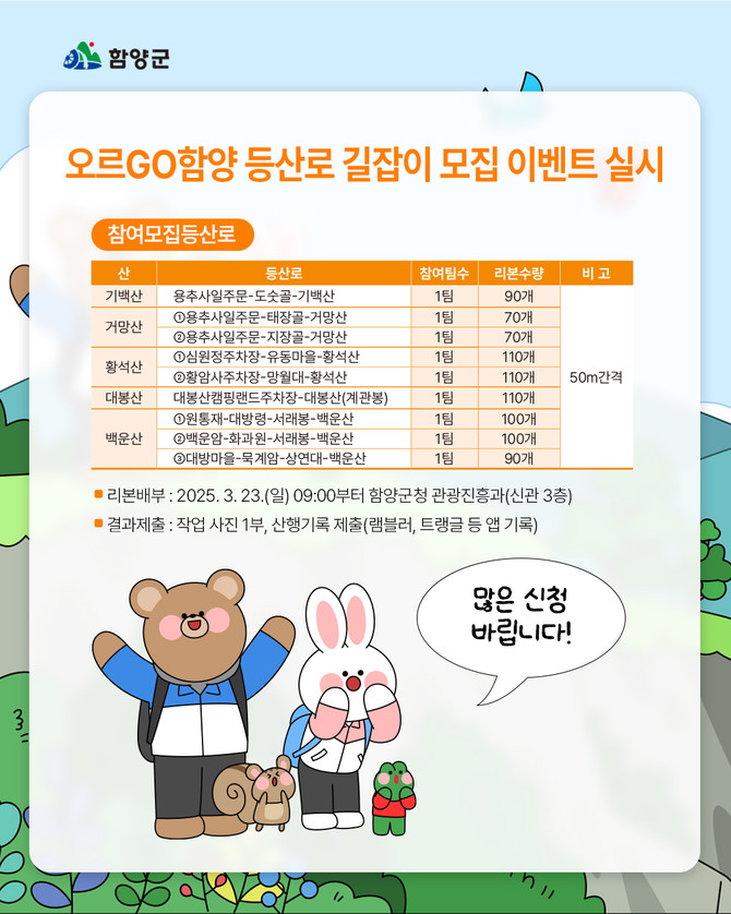 참여 신청은 3월18일부터 19일까지 '오르GO 함양' 전용 전화 문자를 통해 가능하며, 5개 산 9개 등산로에서 추첨을 통해 선정된 각 팀이 지정된 구역에 등산 리본을 설치하게 된다. 이벤트 참여자에게는 '오르GO 함양' 앱 포인트 5만점을 개인별로 지급한다.