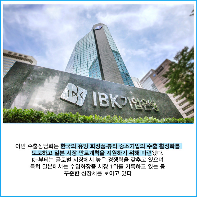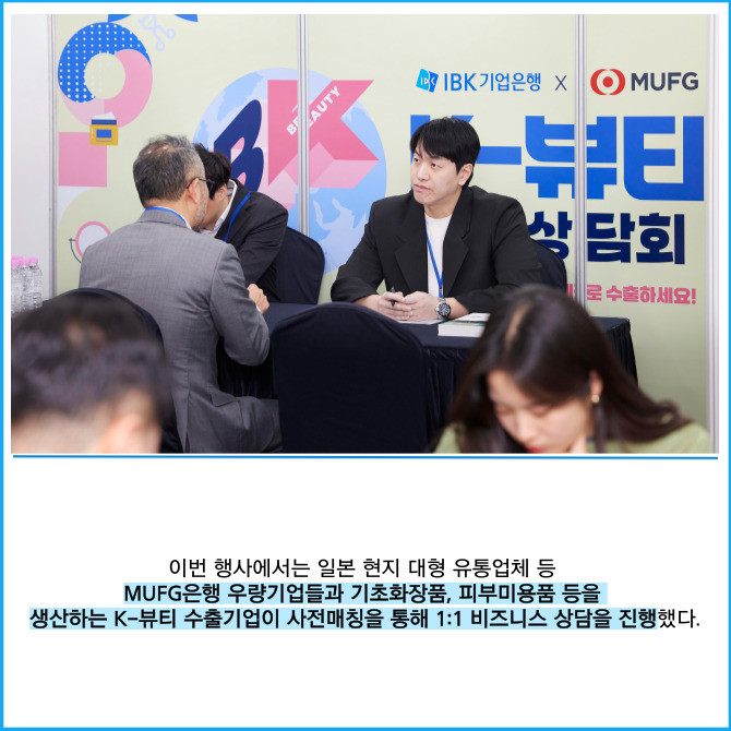 [프라임경제] IBK기업은행(024110)은 지난 17일 서울 중구 IBK파이낸스타워에서 일본 MUFG은행과 공동으로 한·일 수출입기업 25개사가 참여한 'K-뷰티 수출상담회'를 개최했다고 18일 밝혔다.