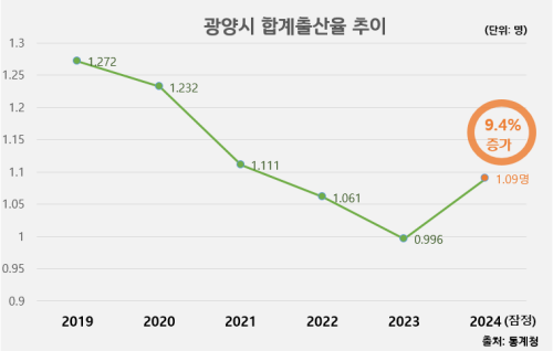 통계청이 지난 2월26일 발표한 2024년 출생·사망 통계(잠정)에 따르면 광양시의 합계출산율(가임기간(15~49세) 여자 1명이 평생 낳을 것으로 기대되는 평균 출생아 수)은 1.09명으로 2년 만에 1명대로 반등했고, 전국 78개 시 중에서 5위를 달성하는 성과를 기록했다.