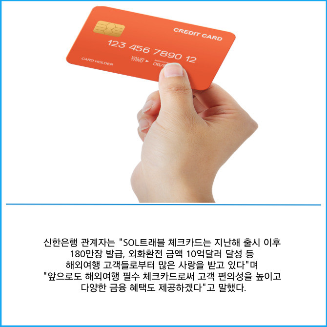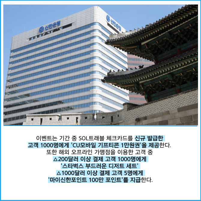 [프라임경제] 신한은행은 지난 14일부터 내달 30일까지 SOL트래블 체크카드 신규 및 해외이용 고객에게 혜택을 제공하는 '봄처럼 설레는 SOL트래블' 이벤트를 진행한다고 19일 밝혔다.