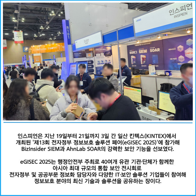 인스피언은 지난 19일부터 21일까지 3일 간 일산 킨텍스(KINTEX)에서 개최된 '제13회 전자정부 정보보호 솔루션 페어(eGISEC 2025)'에 참가해 BizInsider SIEM과 AhnLab SOAR의 강력한 보안 기능을 선보였다.