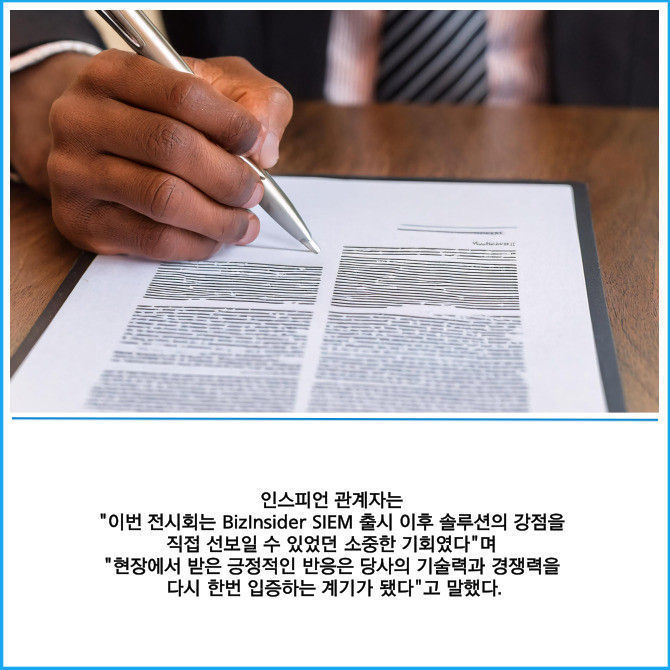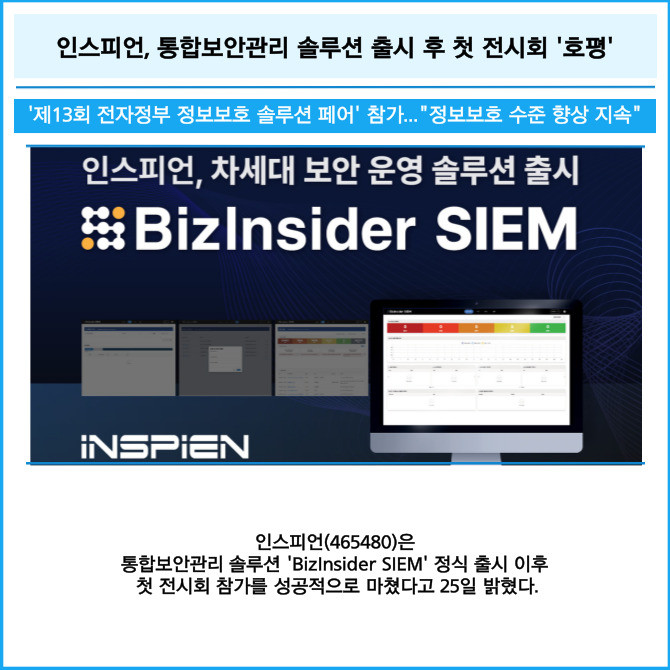 [프라임경제] 인스피언(465480)은 통합보안관리 솔루션 'BizInsider SIEM' 정식 출시 이후 첫 전시회 참가를 성공적으로 마쳤다고 25일 밝혔다.
