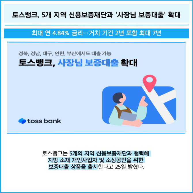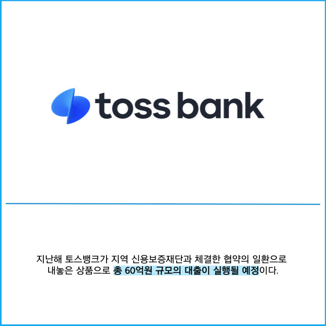 [프라임경제] 토스뱅크는 5개의 지역 신용보증재단과 협력해 지방 소재 개인사업자 및 소상공인을 위한 보증대출 상품을 출시한다고 25일 밝혔다.