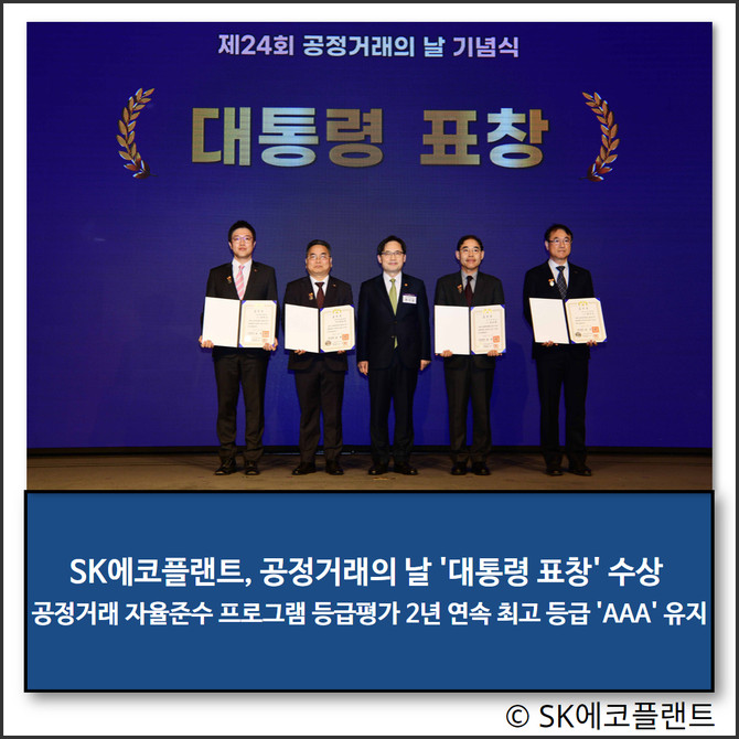 SK에코플랜트가 1일 서울 여의도 중소기업중앙회 케이비즈(KBIZ)홀에서 열린 공정거래의 날 기념식에서 정재훈 부사장(컴플라이언스 담당임원)이 대통령 표창을 수상했다고 밝혔다.