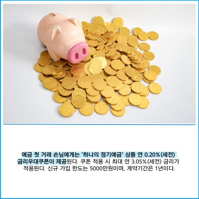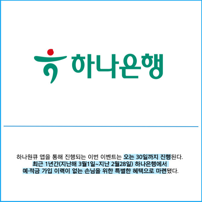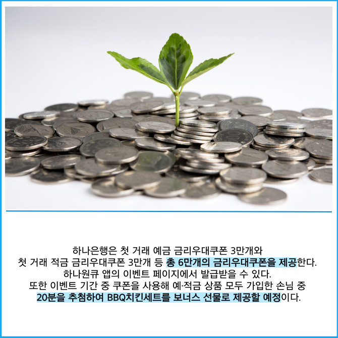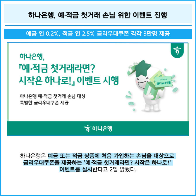 [프라임경제] 하나은행은 예금 또는 적금 상품에 처음 가입하는 손님을 대상으로 금리우대쿠폰을 제공하는 '예·적금 첫거래라면? 시작은 하나로!' 이벤트를 실시한다고 2일 밝혔다.