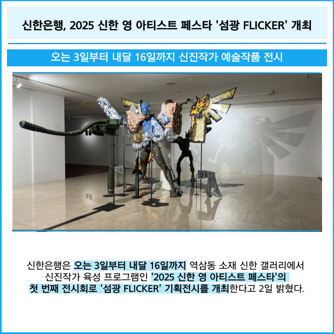 [프라임경제] 신한은행은 오는 3일부터 내달 16일까지 역삼동 소재 신한 갤러리에서 신진작가 육성 프로그램인 '2025 신한 영 아티스트 페스타'의 첫 번째 전시회로 '섬광 FLICKER' 기획전시를 개최한다고 2일 밝혔다.
