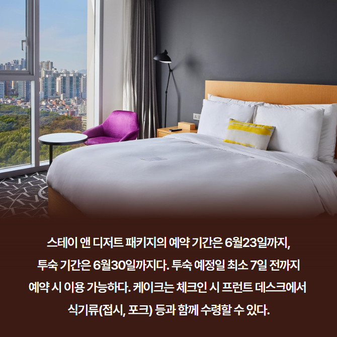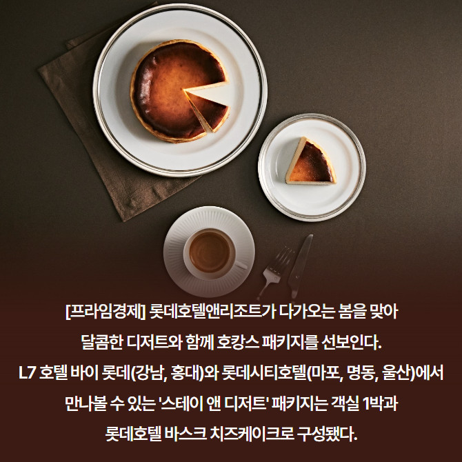 [프라임경제] 롯데호텔앤리조트가 다가오는 봄을 맞아 달콤한 디저트와 함께 호캉스 패키지를 선보인다. L7 호텔 바이 롯데(강남, 홍대)와 롯데시티호텔(마포, 명동, 울산)에서 만나볼 수 있는 '스테이 앤 디저트' 패키지는 객실 1박과 롯데호텔 바스크 치즈케이크로 구성됐다.