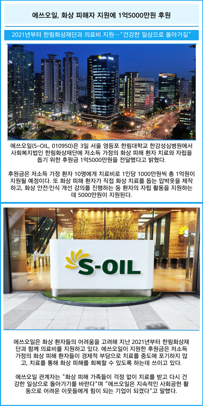 [프라임경제] 에쓰오일(S-OIL, 010950)은 3일 서울 영등포 한림대학교 한강성심병원에서 사회복지법인 한림화상재단에 저소득 가정의 화상 피해 환자 치료와 자립을 돕기 위한 후원금 1억5000만원을 전달했다고 밝혔다.
