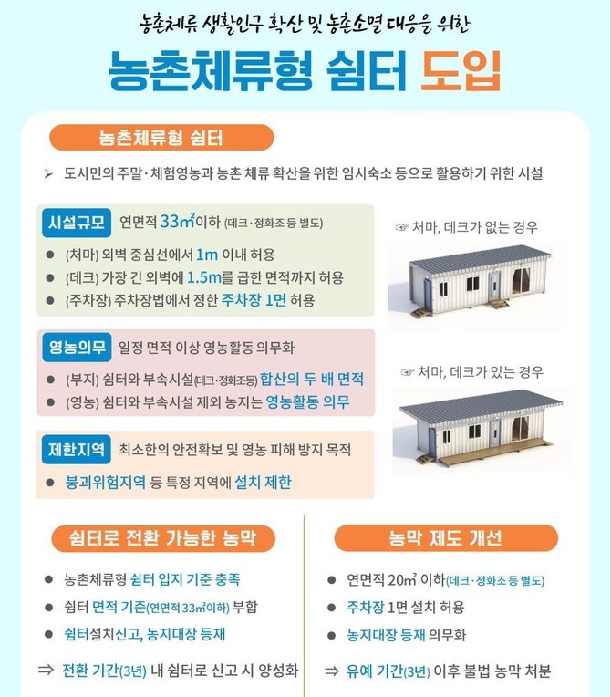 '쉼터'는 농업인과 주말·체험영농 희망자들이 농지전용허가 없이 간편하게 설치할 수 있는 가설건축물이다. 연면적은 33㎡ 이내로 제한되며, 데크·주차장·정화조 등 부속시설은 면적 산정에서 제외돼 실용성과 설치 편의성이 대폭 개선됐다.