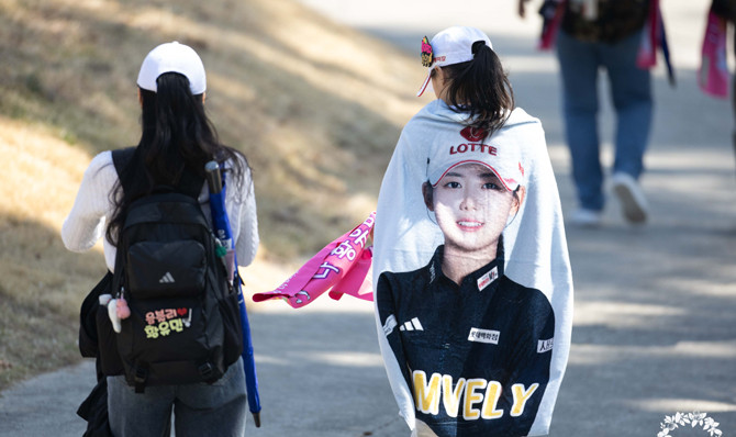 [프라임경제] 한국여자프로골프(KLPGA) 투어 개막전인 '두산건설 We've 챔피언십'에서 황유민의 우승을 기원하는 많은 팬들이 몰린 가운데 황유민의 얼굴이 크게 프린트 된 옷을 입고 황유민을 따라다니고 있다.