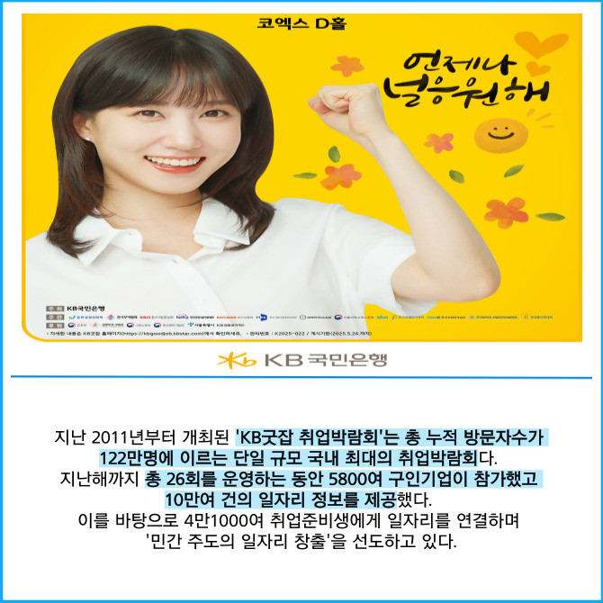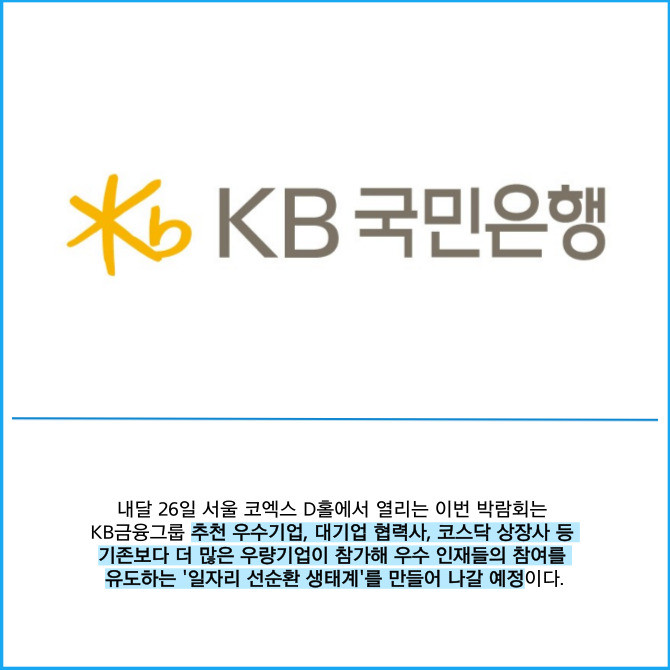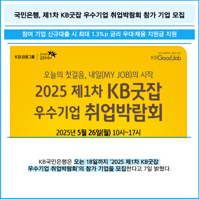 [프라임경제] KB국민은행은 오는 18일까지 '2025 제1차 KB굿잡 우수기업 취업박람회'의 참가 기업을 모집한다고 7일 밝혔다.