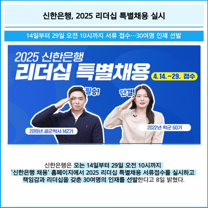 [프라임경제] 신한은행은 오는 14일부터 29일 오전 10시까지 '신한은행 채용' 홈페이지에서 2025 리더십 특별채용 서류접수를 실시하고 책임감과 리더십을 갖춘 30여명의 인재를 선발한다고 8일 밝혔다.