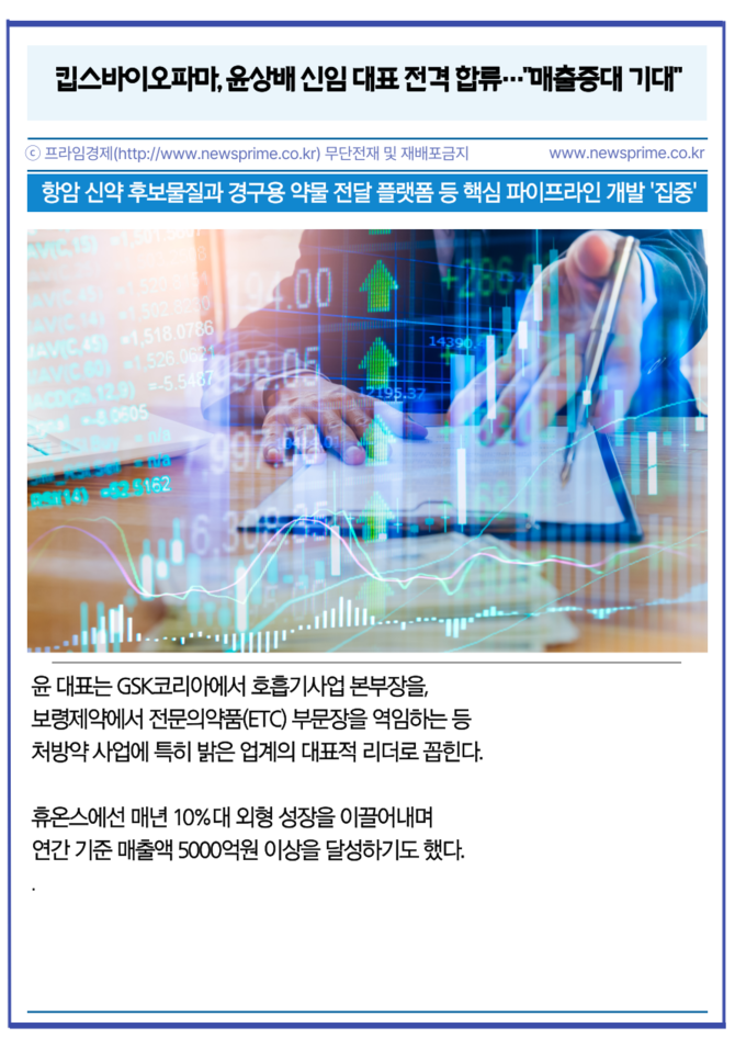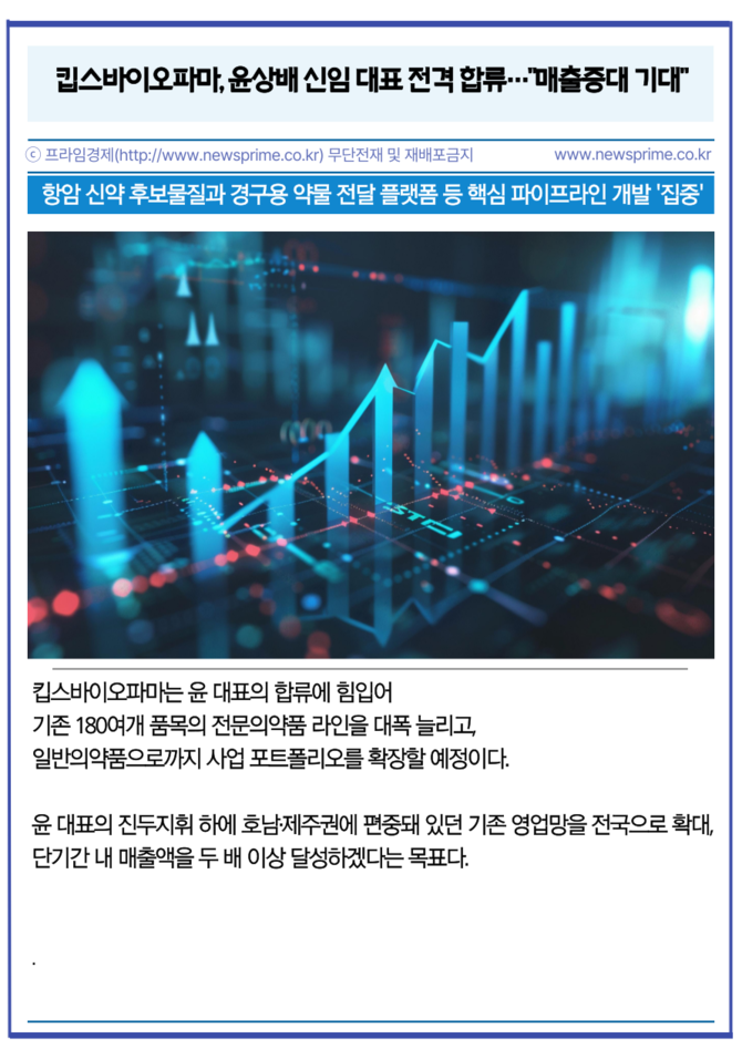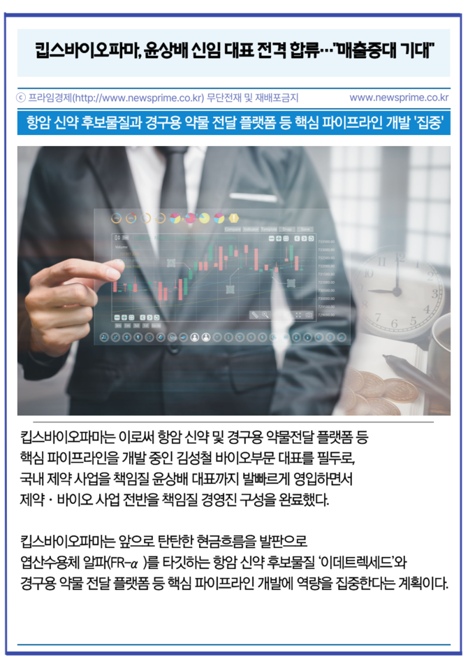 [프라임경제] 킵스바이오파마(256940, 구 케이피에스)는 윤상배 전 휴온스 대표를 새로운 제약부문 대표이사로 선임했다고 8일 밝혔다.