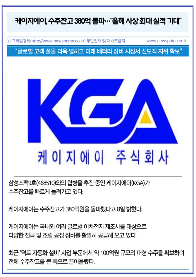 [프라임경제] 삼성스팩9호(468510)와의 합병을 추진 중인 케이지에이(KGA)가 수주잔고를 빠르게 늘려가고 있다. 케이지에이는 수주잔고가 380억원을 돌파했다고 8일 밝혔다.