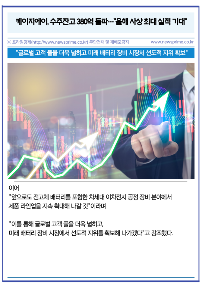 케이지에이는 올해 사상 최초 연간 1000억원대 신규 수주 달성을 기대하고 있다. 현재 빅3를 포함해 북미·유럽의 주요 이차전지 기업들과 프로젝트 협의를 순조롭게 진행하고 있으며, 이 중에는 전고체 배터리용 공정 장비도 포함돼 있다.