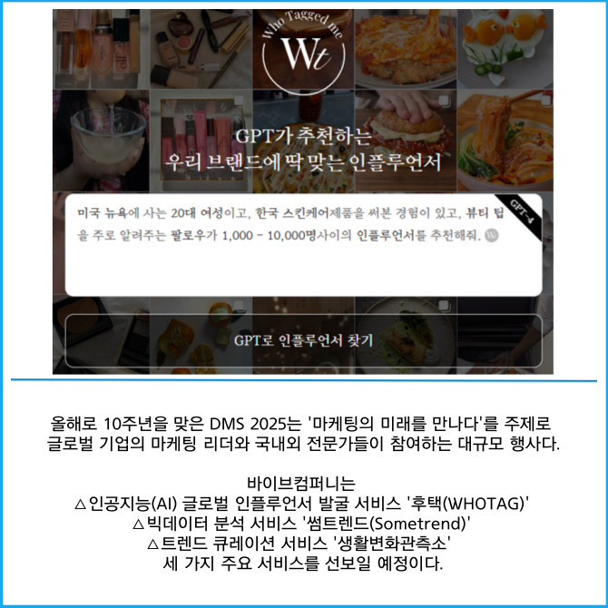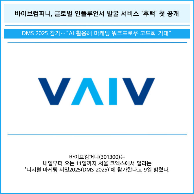 [프라임경제] 바이브컴퍼니(301300)는 내일부터 오는 11일까지 서울 코엑스에서 열리는 '디지털 마케팅 서밋2025(DMS 2025)'에 참가한다고 9일 밝혔다.