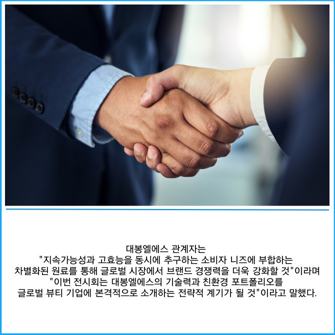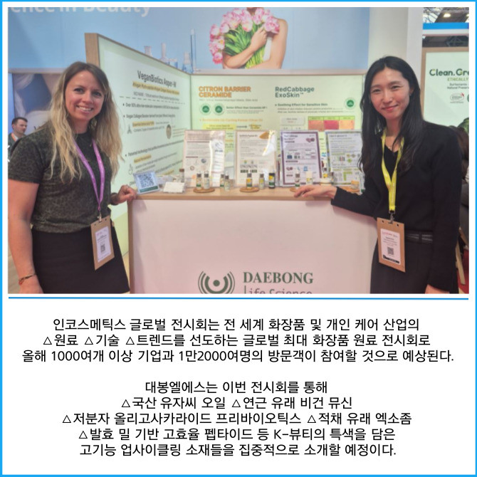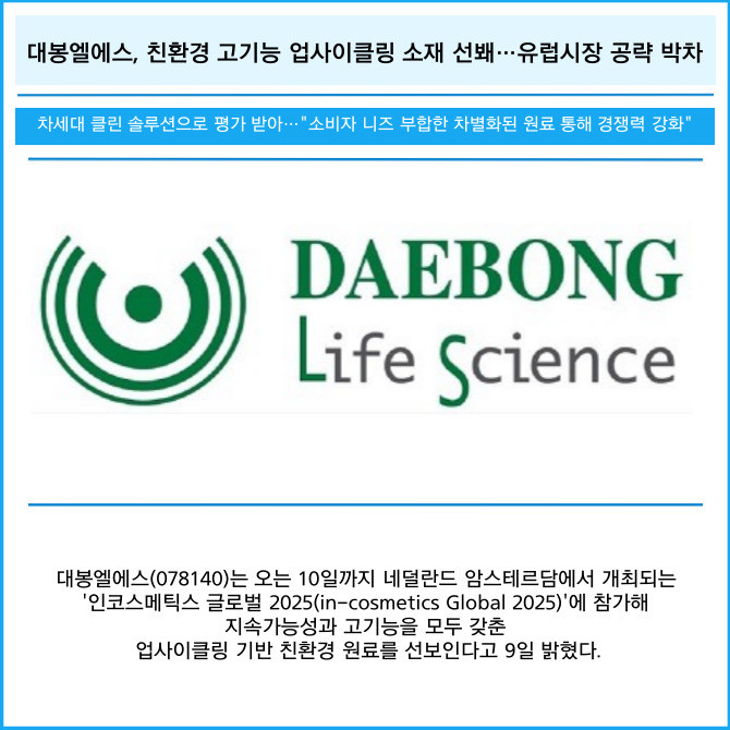 [프라임경제] 대봉엘에스(078140)는 오는 10일까지 네덜란드 암스테르담에서 개최되는 '인코스메틱스 글로벌 2025(in-cosmetics Global 2025)'에 참가해 지속가능성과 고기능을 모두 갖춘 업사이클링 기반 친환경 원료를 선보인다고 9일 밝혔다.