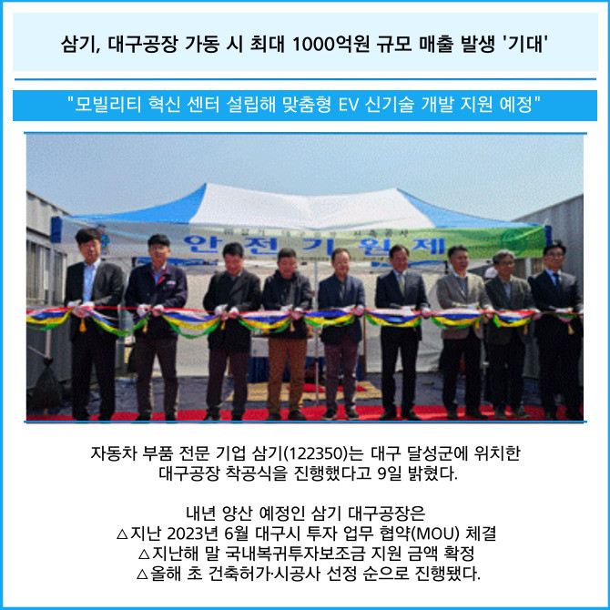 [카드] 삼기, 대구공장 가동 시 최대 1000억원 규모 매출 발생 '기대'