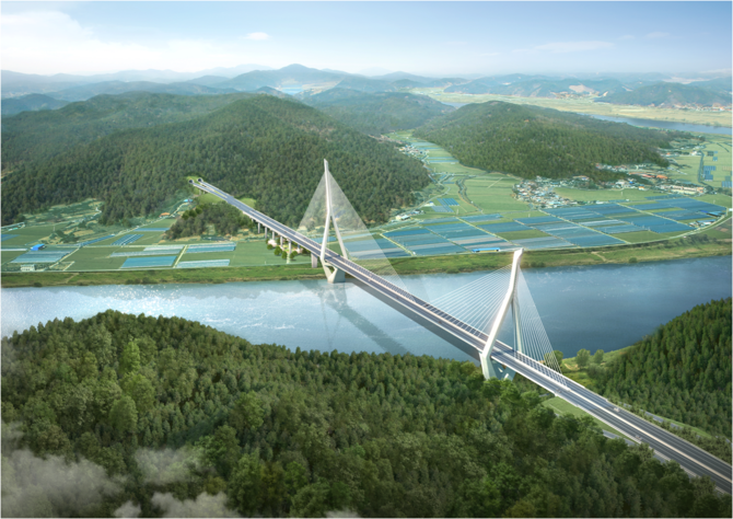 이 가운데 가장 주목받는 구간은 총 연장 1,000m의 '의령낙동대교'다. 경사 고저주탑 사장교(700m)와 PSC-e 빔(300m)을 결합한 구조로 설계됐으며, 낙동강을 횡단하면서 자연 경관과 조망성을 최대한 살린 점이 특징이다. 경남도는 경남 서북부 지역의 상징적 구조물로 자리매김할 것으로 기대했다.