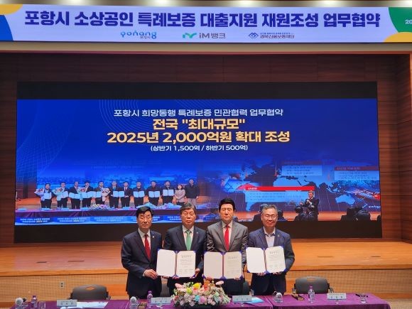 [프라임경제] 경북신용보증재단과 포항시, iM뱅크가 9일 소상공인의 자금난 해소를 위해 '2025 포항시 희망동행 소상공인 특례보증'보증규모 확대를 위한 업무협약을 체결했다.