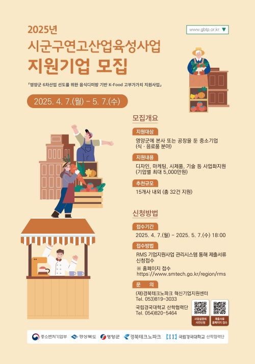 [프라임경제] 경북테크노파크(원장 하인성)는 '2025년 시군구연고산업육성 협업프로젝트'의 일환으로 6차산업 선도를 위한 영양군 소재 식·음료품 분야 중소기업을 오는 5월7일까지 모집한다.