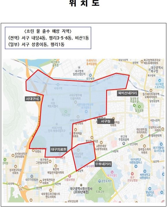 이번 수계 환원으로 4월10일 22시부터 다음날 06시까지 서구 내당4동, 평리3·5·6동, 비산1동 전역, 상중이동, 평리1동 일부 2만2000세대에서 흐린 물이 나올 수 있다.