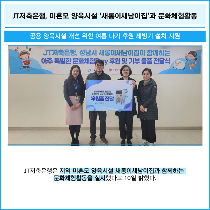 [프라임경제] JT저축은행은 지역 미혼모 양육시설 새롱이새남이집과 함께하는 문화체험활동을 실시했다고 10일 밝혔다.