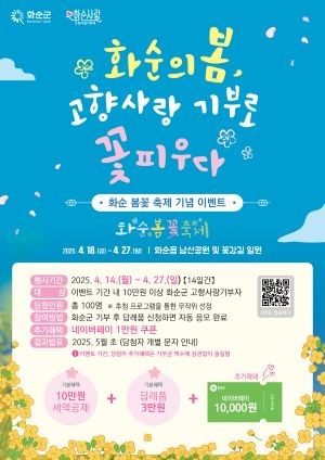 [프라임경제] 화순군(군수 구복규)이 오는 4월14일부터 4월27일까지 '2025 화순 봄꽃 축제'를 맞아 특별한 고향사랑기부제 홍보 이벤트를 펼친다.