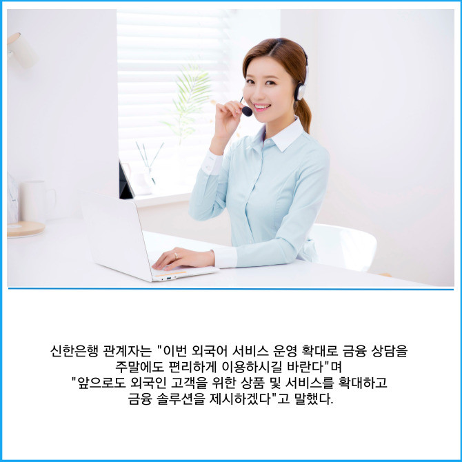 [프라임경제] 신한은행은 오는 12일부터 외국인 고객의 편의성을 높이기 위해 외국어 고객상담센터의 영어·베트남어·러시아어 상담서비스를 주말에도 제공한다고 11일 밝혔다.