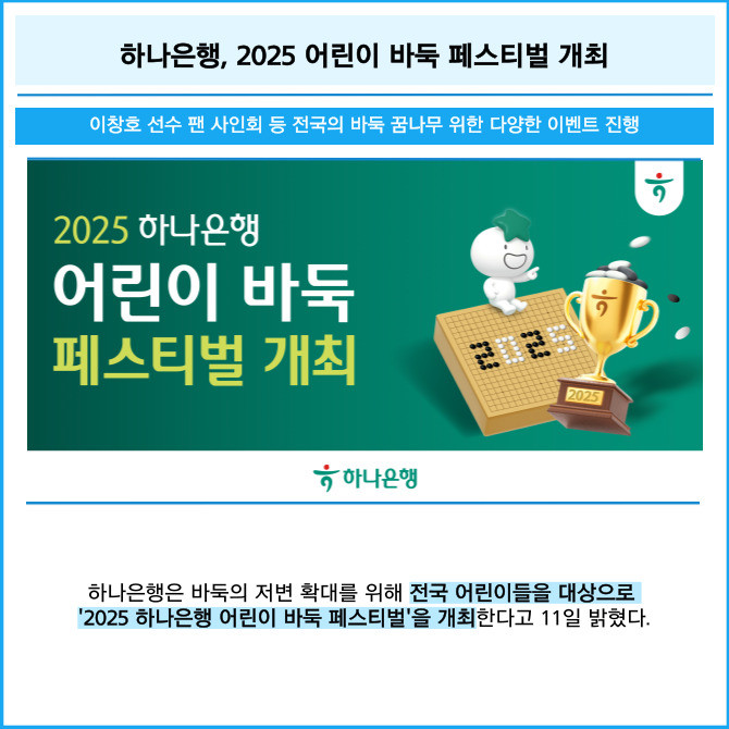 [프라임경제] 하나은행은 바둑의 저변 확대를 위해 전국 어린이들을 대상으로 '2025 하나은행 어린이 바둑 페스티벌'을 개최한다고 11일 밝혔다.