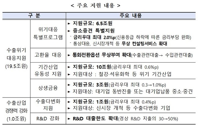 아울러 위기 산업에 대한 유동성 공급도 강화한다. 석유화학, 철강 등 위기 기간산업에 10조원 규모의 유동성을 공급하고, 대기업과 동반 진출하거나 납품 관계에 있는 중소·중견기업에는 3조원의 상생금융을 지원한다.