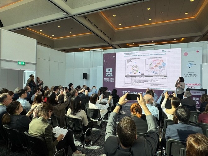 또 '식물 엑소좀 유래 miRNA(마이크로RNA)의 피부 개선 효과'에 대한 구두 발표(테크니컬 세미나)도 진행해 미국, 프랑스, 스페인, 폴란드, 우크라이나 등 다양한 글로벌 바이어로부터 호평을 받았다고 회사 측은 전했다.