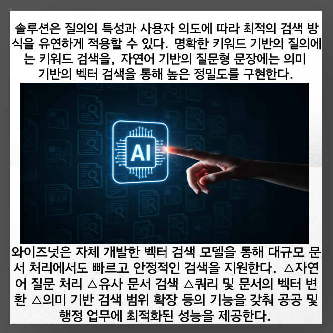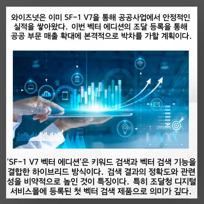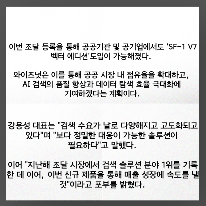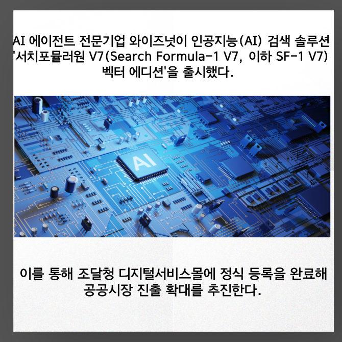 [프라임경제] AI 에이전트 전문기업 와이즈넛(대표 강용성, 096250)이 인공지능(AI) 검색 솔루션 '서치포뮬러원 V7(Search Formula-1 V7, 이하 SF-1 V7) 벡터 에디션'을 15일 출시했다. 이를 통해 조달청 디지털서비스몰에 정식 등록을 완료했다. 제품 출시와 동시에 공공시장 진출 확대를 추진한다는 계획이다.