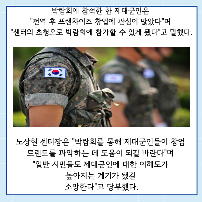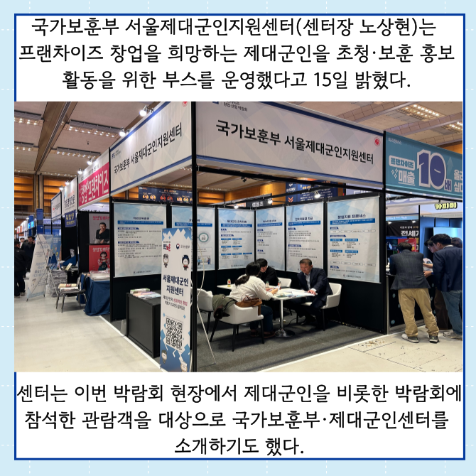 [프라임경제] 국가보훈부 서울제대군인지원센터(센터장 노상현, 이하 센터)는 제대군인을 위한 프랜차이즈 산업 견학을위해 부스를 운영했다고 15일 밝혔다.