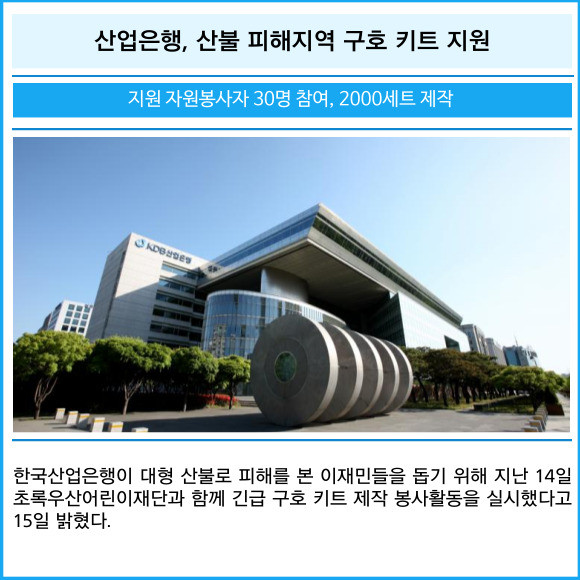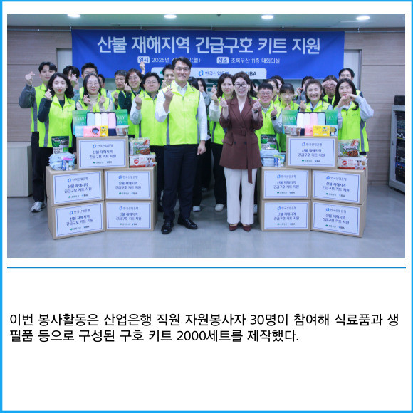 [프라임경제] 한국산업은행이 대형 산불로 피해를 본 이재민들을 돕기 위해 지난 14일 초록우산어린이재단과 함께 긴급 구호 키트 제작 봉사활동을 실시했다고 15일 밝혔다.