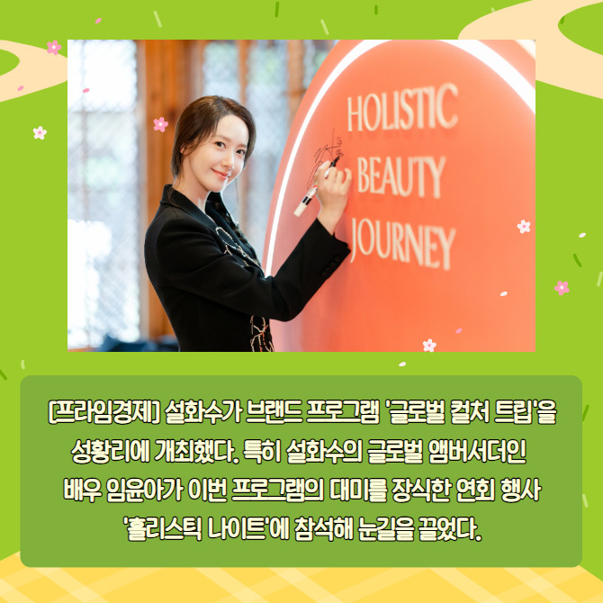 [프라임경제] 설화수가 브랜드 프로그램 '글로벌 컬처 트립'을 성황리에 개최했다. 특히 설화수의 글로벌 앰버서더인 배우 임윤아가 이번 프로그램의 대미를 장식한 연회 행사 '홀리스틱 나이트'에 참석해 눈길을 끌었다.
