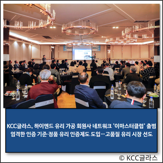 KCC글라스(344820)가 하이엔드 유리 가공 회원사 네트워크인 '이마스터클럽(e-MASTER Club)'을 출범, 회원사 대상으로 첫 세미나를 개최했다.