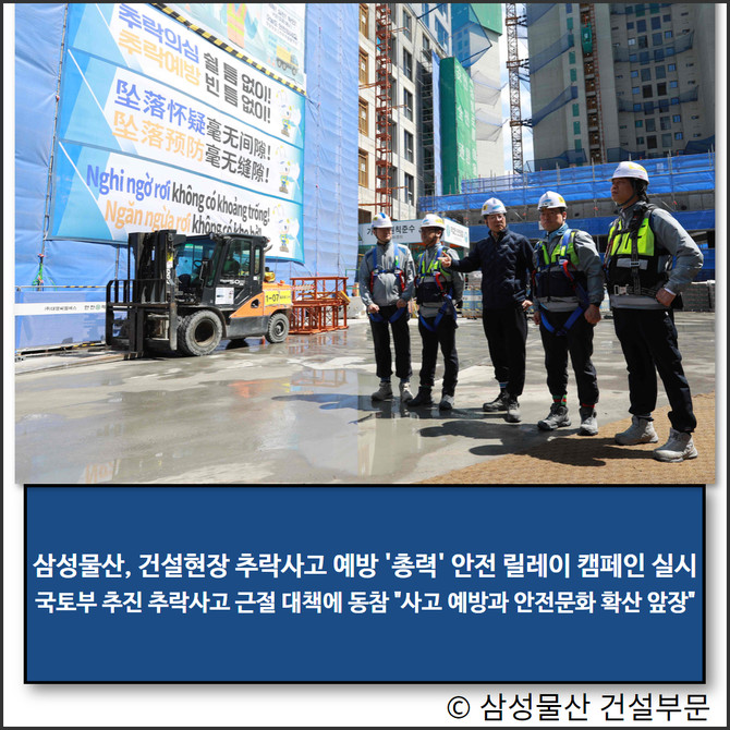 이번 캠페인은 최근 3년간 건설현장에서 발생한 사망사고 유형의 절반 이상을 차지하는 추락사고를 근절하기 위해 국토교통부가 추진하는 예방 대책의 일환이며, 지난 14일부터 다음달 23일까지 주요 건설사를 중심으로 릴레이 캠페인을 이어 나간다. 이 날 행사에 참석한 안병철 삼성물산 CSO 부사장은 현장을 직접 점검했다.