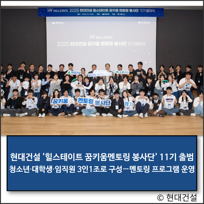 현대건설은 지난 15일 서울 종로구 계동 본사에서 사회복지법인 초록우산 어린이재단과 함께 '힐스테이트 꿈키움멘토링 봉사단(꿈키움 멘토링 봉사단)' 11기 발대식을 진행했다고 16일 밝혔다.