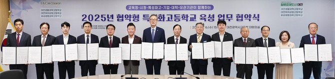 [프라임경제] 대전시교육청은 지난 16일 교육청 별관 대회의실에서 '대전과 함께 성장하는 인재, 대전이 함께 디자인하는 학교'를 슬로건으로, 대전의 미래핵심전략산업에 필요한 기술인재 양성을 위한 협약형 특성화고등학교 육성 업무협약을 체결했다.