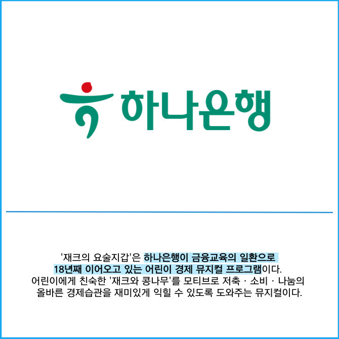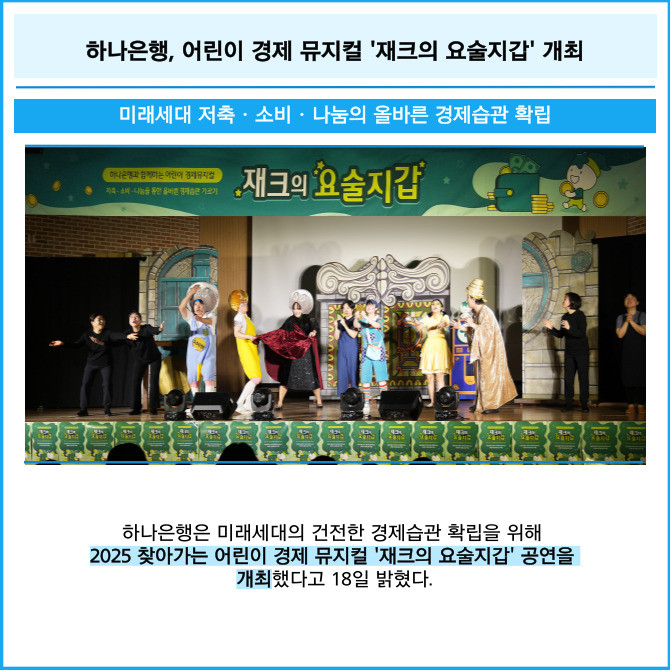 [프라임경제] 하나은행은 미래세대의 건전한 경제습관 확립을 위해 2025 찾아가는 어린이 경제 뮤지컬 '재크의 요술지갑' 공연을 개최했다고 18일 밝혔다.