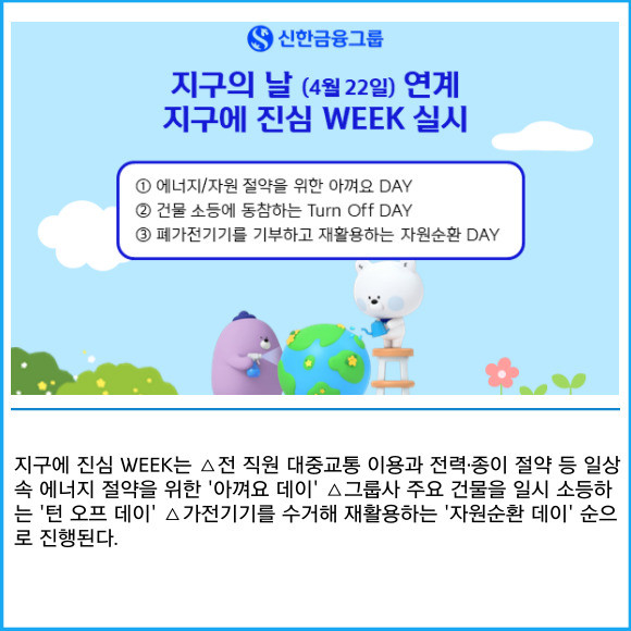 [프라임경제] 신한금융그룹(055550)이 일주일간 에너지 절약을 위한 '지구에 진심 WEEK'를 실시한다고 21일 밝혔다.