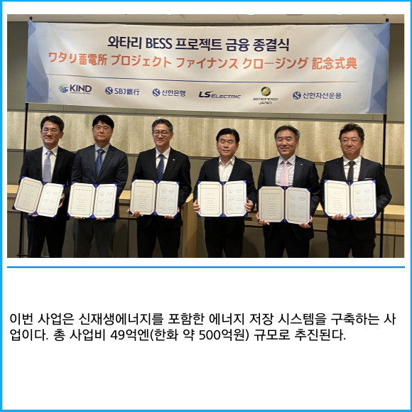 [프라임경제] 신한금융그룹(055550)이 일본 미야기현 와타리 지역의 배터리 에너지 저장 시스템(이하 BESS) 개발 사업에 금융 주선·대주로서 참여한다고 22일 밝혔다.